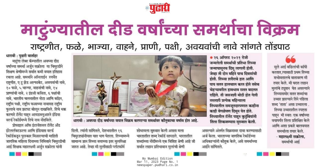 New Delhi (India) July 11 : Samartha was born in Mumbai, Maharashtra, on August 26, 2021. Her mother, Mahalakshmi Pillai, began training her when she was just five months old. Samartha Mahalakshmi gained global recognition for her extraordinary IQ and communication skills. At 2 years and 10 months old, she has already achieved numerous accolades.